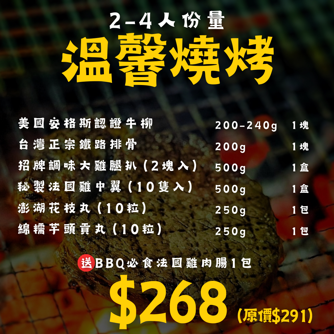 溫馨燒烤套餐(2-4人份)|鐵路排骨、牛柳、雞腿扒、秘製法國雞中翼、澎湖花枝丸、芋頭貢丸、雞肉腸